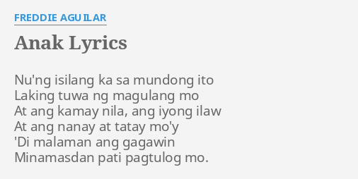 Listen to Filipino music with lyrics. Anak lyrics Freddie Aguilar Lyrics Anak Noong isilang ka sa mundong ito Laking tuwa ng magulang mo At ang kamay nila ang iyong ilaw At ang nanay at tatay moy Di malaman ang gagawin Minamasdan pati pagtulog mo At sa gabiy napupuyat ang iyong nanay Sa pagtimpla ng gatas mo At sa umaga namay kalong ka Ng iyong amang tuwang-tuwa sa iyo. Di malaman ang gagawin.